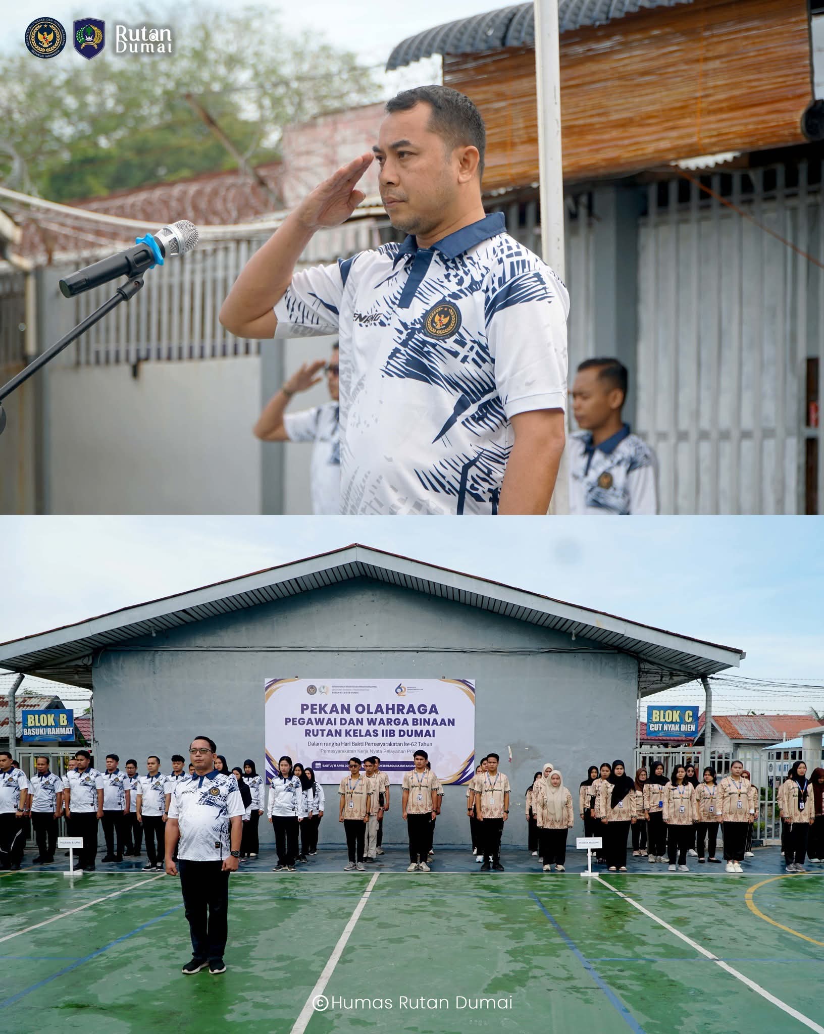 DIRGANUSANTARA.COM-Dumai - Rutan Kelas IIB Dumai menggelar Apel Pembukaan Pekan Olahraga Pegawai dan Warga Binaan dalam rangka memperingati Hari Bakti Pemasyarakatan (HBP) ke-62 yang digelar di lapangan serbaguna Rutan Dumai, Sabtu (11/4).